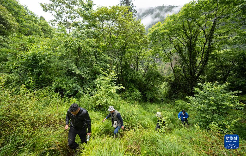 6月15日,波密縣林草局工作人員西繞(左)帶領(lǐng)大家穿過原始森林尋找亞洲第一高樹。新華社記者 費茂華 攝