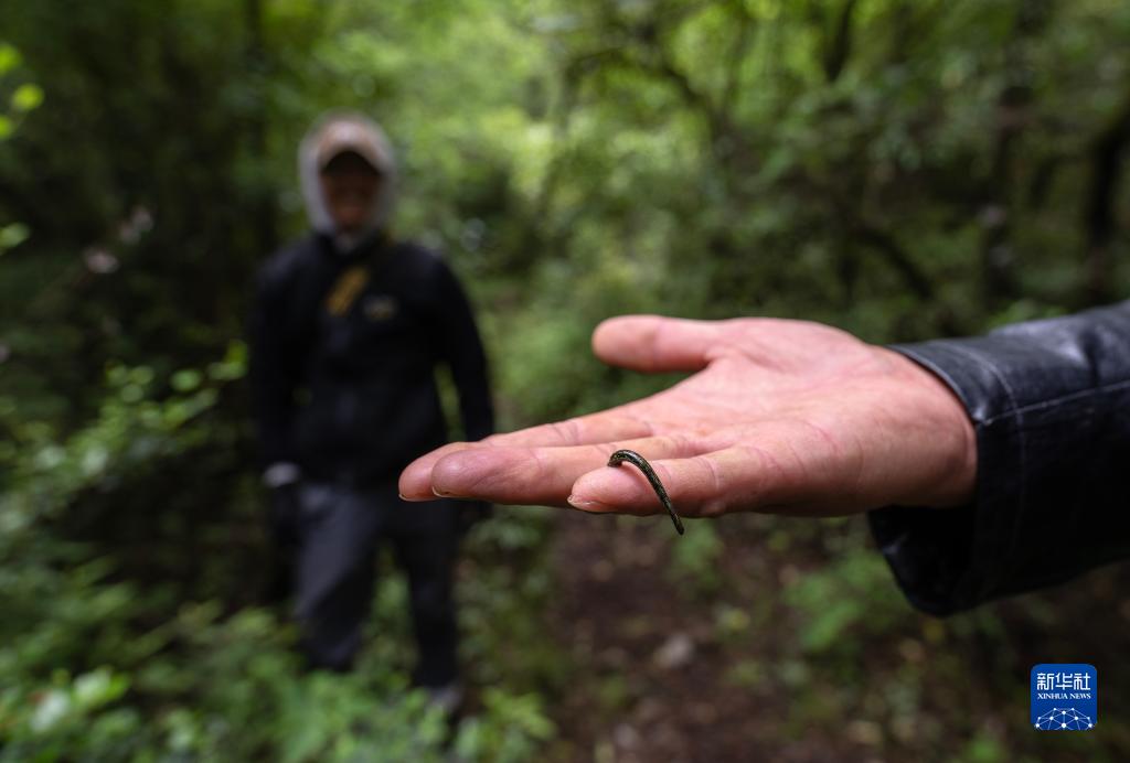 6月15日,波密縣林草局工作人員西繞在路程中被一只螞蟥咬住手指。新華社記者 費茂華 攝