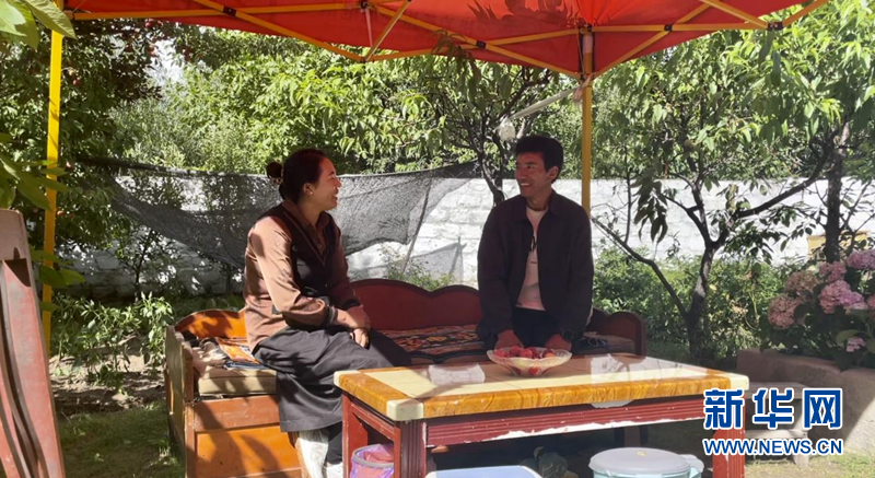 圖為嘎拉村村民達(dá)瓦參堅和妻子在自家的院子里聊天,身后是小菜園和不同的果樹。新華網(wǎng) 陳穎 攝