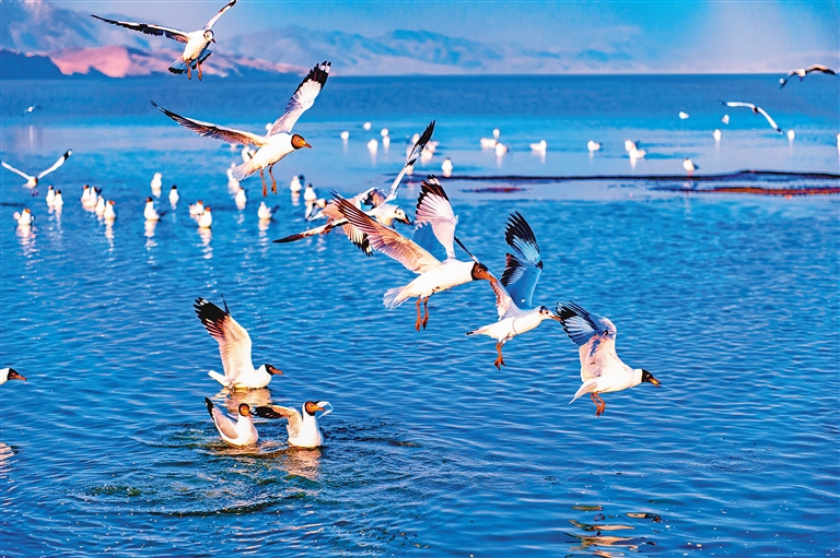班公湖上,自由飛翔的海鷗。阿里地委宣傳部供圖