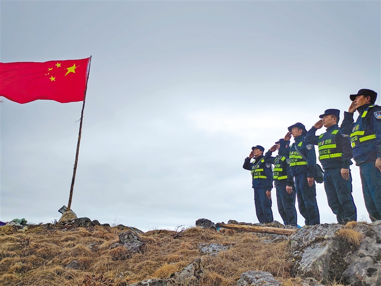 立新邊境派出所民警前往仁滇牧場巡邏踏查時(shí)向國旗宣誓。圖片由日喀則邊境管理支隊(duì)提供