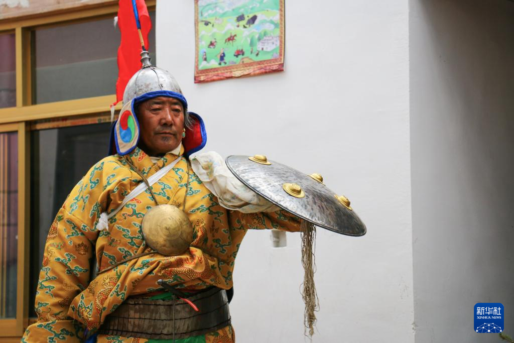 在赤德村,流傳于此的宮廷禮儀舞蹈“仲”舞,距今已有百年歷史,其中一幕是舞者頭頂青稞酒壺給客人敬酒,以體現(xiàn)崇高的迎客禮儀。在西德村,“果爾孜”舞的“將士們”身著盔甲、頭戴頭盔、手持劍盾,和著由慢漸快的鼓聲,贊美出征的將士、崇拜保家護國的兵器……