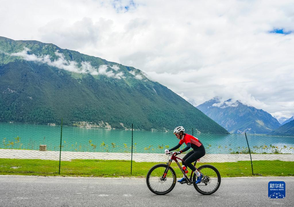 9月9日,老隊(duì)員車隊(duì)選手白瑪央吉在比賽中經(jīng)過(guò)巴松措湖區(qū)。新華社發(fā)(劉劍璞 攝)