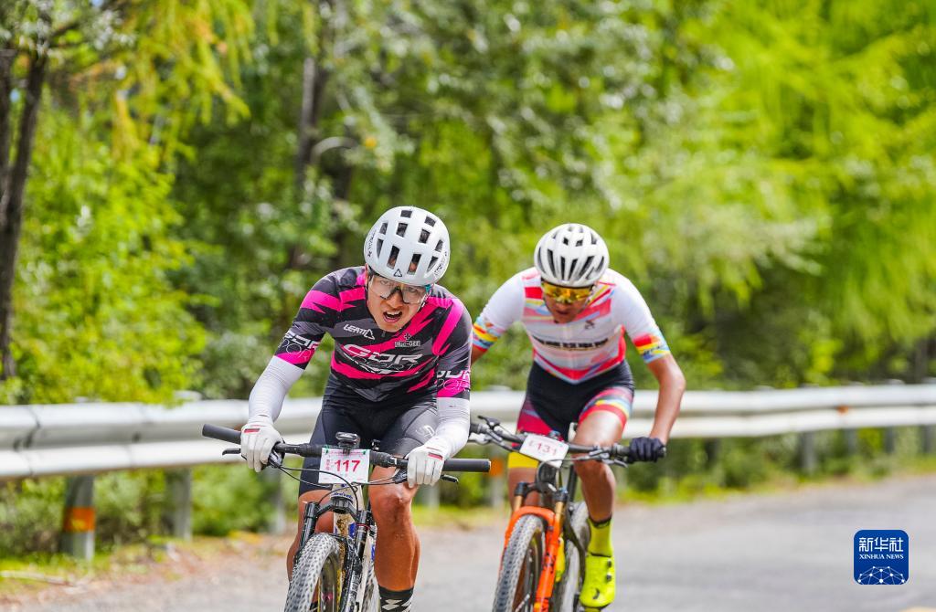 9月10日,北京GDR車隊(duì)選手黃世海(前)和亞車隊(duì)選手江村羅布在比賽中。最終,江村羅布和黃世海分獲男子組冠、亞軍。新華社發(fā)(劉劍璞 攝)