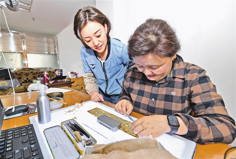 西藏自治區(qū)圖書(shū)館古籍保護(hù)中心工作人員在進(jìn)行古籍粘貼修復(fù)。唐斌 攝