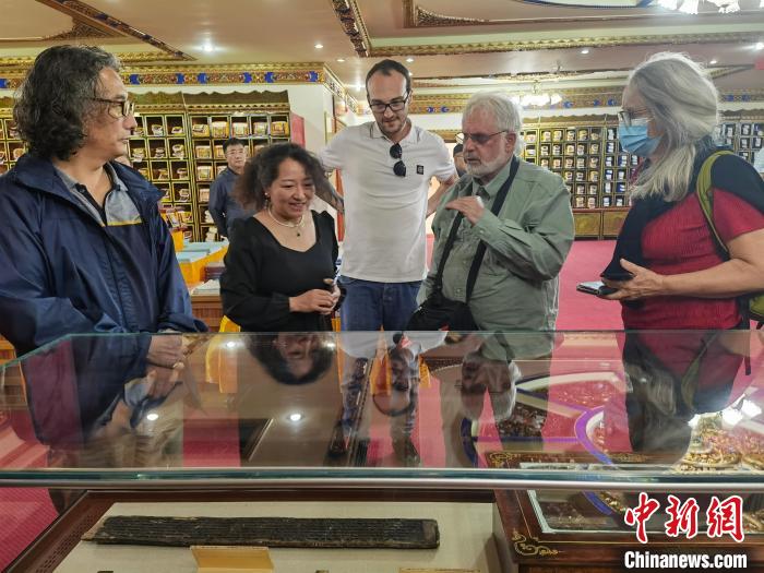 9月20日,外籍專家記者團(tuán)參觀西藏大學(xué)圖書館藏文古籍研究所。中新社記者 趙延 攝