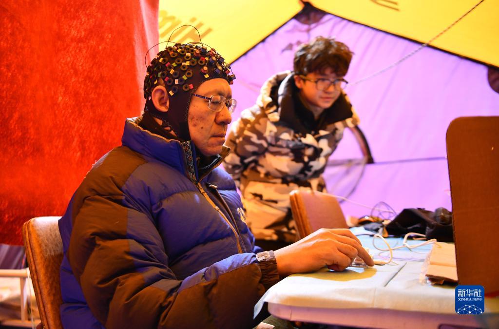 在卓奧友峰登山大本營,中科院院士朱彤佩戴全腦彈性測試帽,測試人體認(rèn)知能力(10月1日攝)。新華社記者 晉美多吉 攝