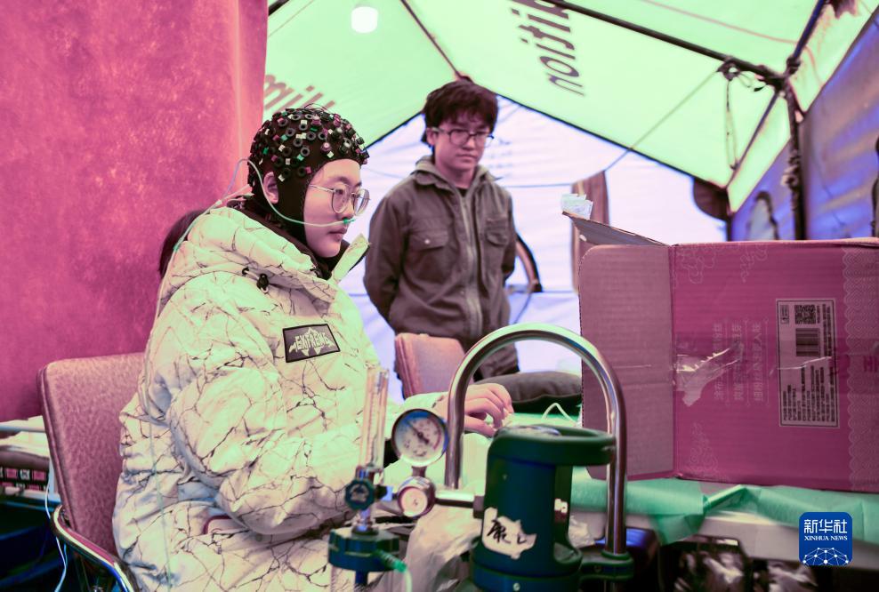 在卓奧友峰登山大本營,科考隊(duì)員(前)佩戴全腦彈性測試帽,測試有氧和無氧狀態(tài)下的人體認(rèn)知能力(9月29日攝)。新華社記者 晉美多吉 攝