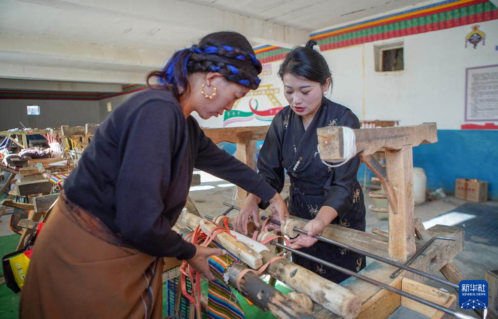 10月9日,旦增卓嘎與合作社工人一起組裝傳統(tǒng)織機(jī)。新華社記者邵澤東 攝
