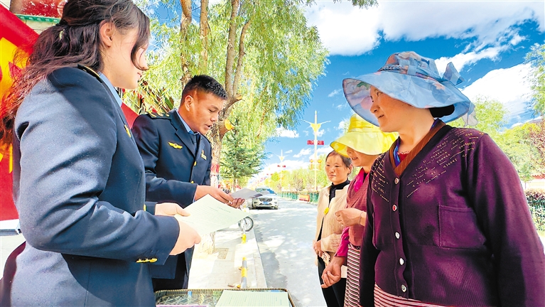 圖為山南市瓊結(jié)縣市場監(jiān)督管理局執(zhí)法人員向群眾發(fā)放知識(shí)產(chǎn)權(quán)相關(guān)宣傳冊(cè)。記者 白瑪澤旺 通訊員 倫珠澤仁 攝
