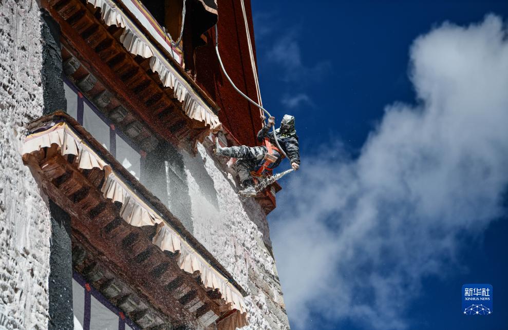 工作人員對(duì)布達(dá)拉宮外墻噴灑涂料(10月18日攝)。新華社記者 晉美多吉 攝