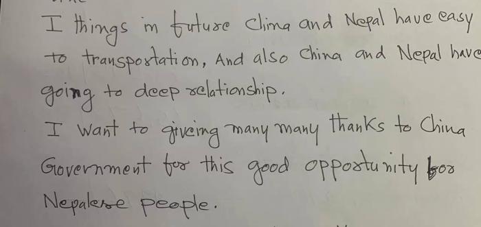 國(guó)之交在于民相親,民相親在于心相通。采訪(fǎng)過(guò)后,這位老人認(rèn)認(rèn)真真地用英文寫(xiě)下一封信并交給中新網(wǎng)記者。他說(shuō):“我相信,未來(lái)中尼交通將更加便利,兩國(guó)情誼將更加深厚。我非常、非常地感謝中國(guó)政府,為尼泊爾人民帶來(lái)了這些大好機(jī)會(huì)?!?/p>