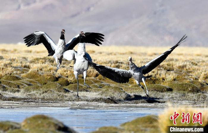 10月21日,黑頸鶴在西藏那曲市申扎縣買(mǎi)巴鄉(xiāng)附近的濕地“翩翩起舞”。 李林 攝