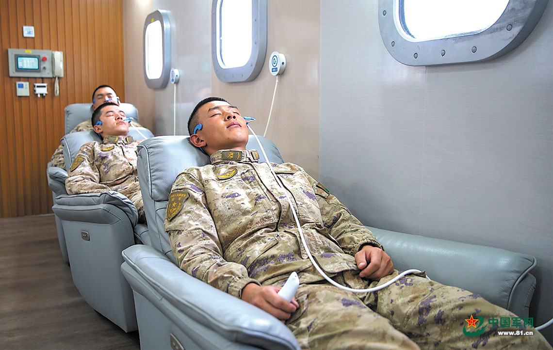 吃好每頓飯,在邊防部隊(duì)已不是新鮮事。對(duì)第一次走上高原的官兵來(lái)說(shuō),最擔(dān)心的是缺氧。筆者在海拔4700多米的某邊防連看到,剛走下哨位的戰(zhàn)士們進(jìn)入微壓氧艙進(jìn)行休整??戳艘粫?huì)兒書,聽(tīng)了一會(huì)兒音樂(lè),幾名戰(zhàn)士很快便進(jìn)入夢(mèng)鄉(xiāng)。