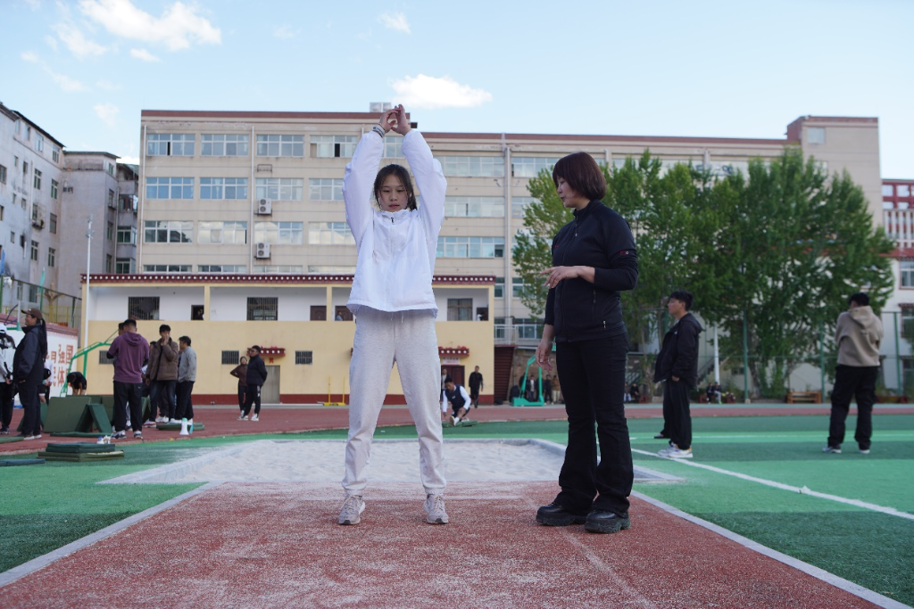 馬曉衛(wèi)正在指導(dǎo)昌都市第一高級(jí)中學(xué)的學(xué)生立定跳遠(yuǎn)。新華社記者 邵澤東 攝