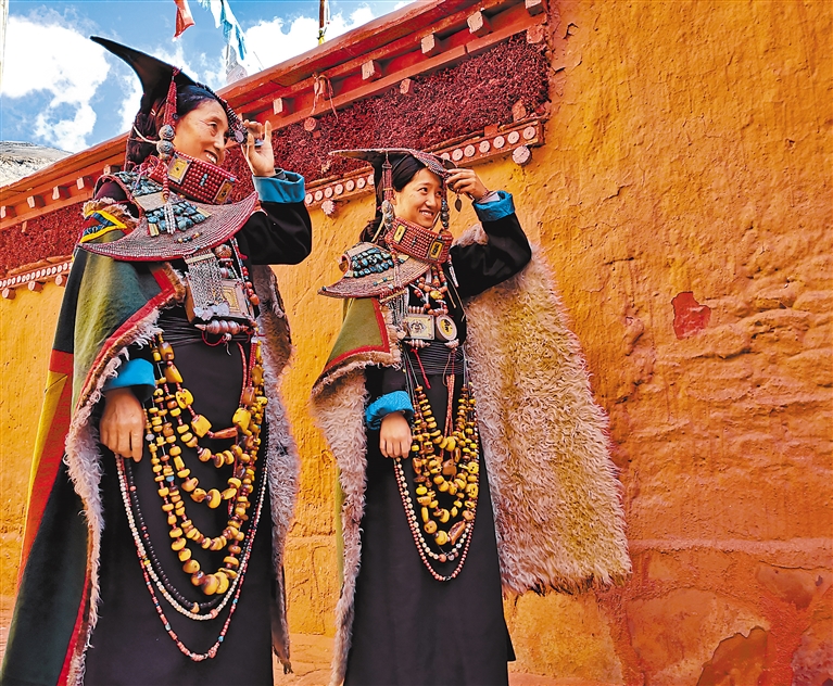 一大早,19歲的少女巴桑倉決和表姐巴桑普赤就開始整理各自傳承的“飛天服”。她們打開箱子,拿出精致的衣袍、披風(fēng)和綴滿珠寶的頭飾、項(xiàng)鏈,鄭重地穿戴在身上。當(dāng)整套“飛天服”呈現(xiàn)在眾人眼前時(shí),大家無不為之驚嘆。