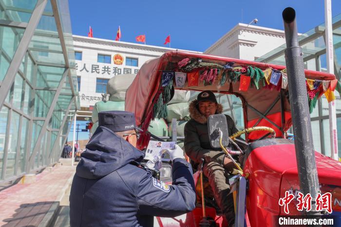 圖為里孜出入境邊防檢查站移民管理警察查驗(yàn)首臺通關(guān)車輛。郭遠(yuǎn)敬 攝