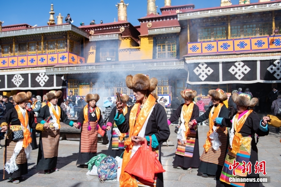 11月15日,西藏拉薩,拉薩婦女在扎基寺跳起傳統(tǒng)舞蹈,迎“仙女節(jié)”?!跋膳?jié)”即吉祥天母節(jié),藏語稱“白來日追”。相傳藏傳佛教最高護法神之一班丹拉姆的女兒白拉姆,不顧母親的反對與赤尊贊私定終身,班丹拉姆一怒之下將赤尊贊趕到拉薩河南岸,規(guī)定二人僅每年的藏歷十月十五日相見。中新社記者 貢嘎來松 攝