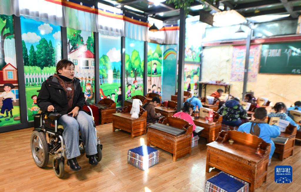 卓嘎在藏文書法班上輔助老師上課(12月2日攝)。新華社記者 晉美多吉 攝