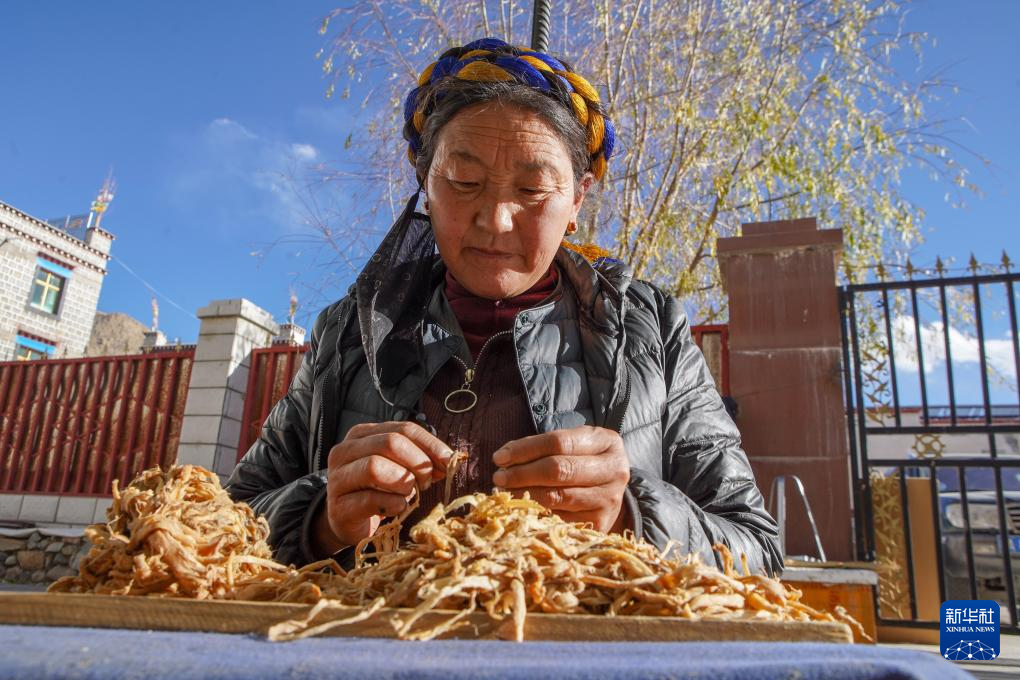 尼木縣塔榮鎮(zhèn)雪拉村村民在給狼毒草分絲,這是制作藏紙的步驟之一(12月5日攝)。新華社記者 關明輝 攝