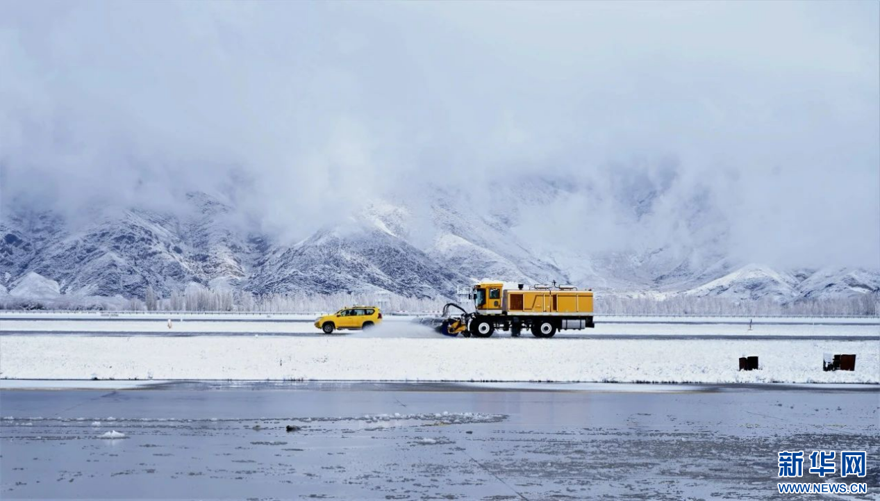 圖為拉薩貢嘎機(jī)場機(jī)坪除冰雪保障作業(yè)。新華網(wǎng) 白瑪群宗 攝
