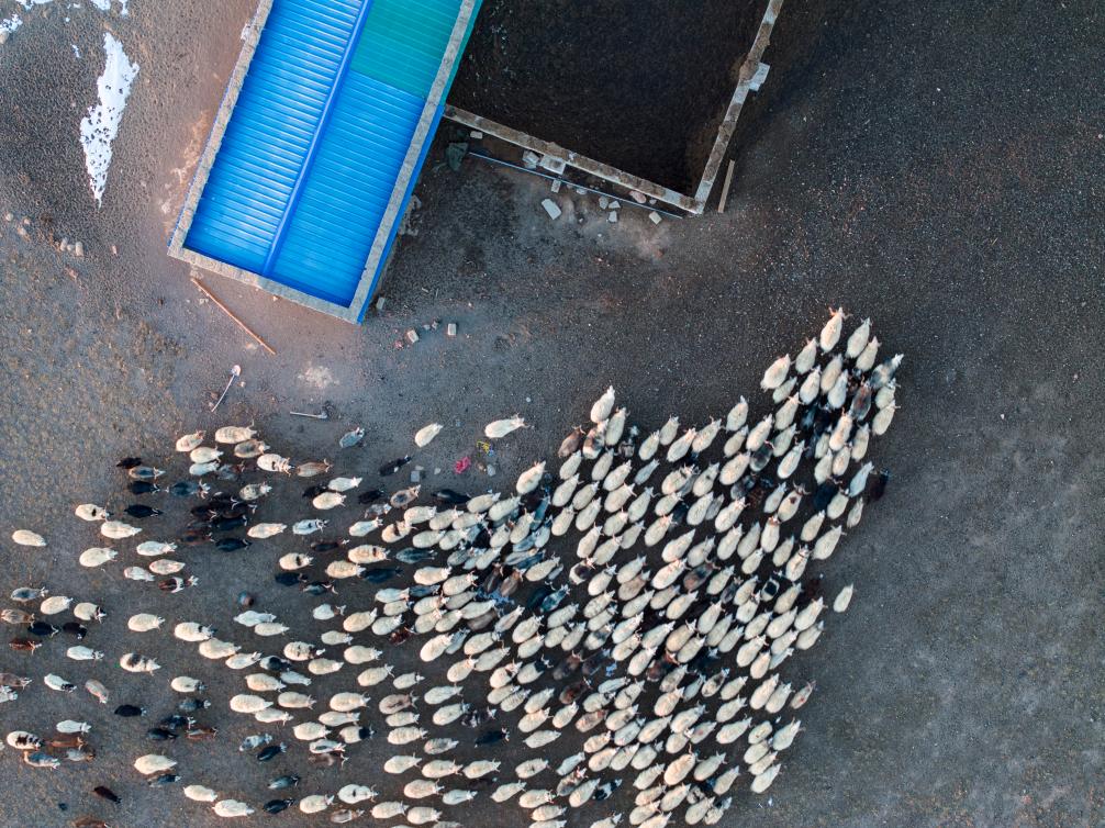 丹增家的羊正進入新羊圈(12月18日攝,無人機照片)。新華社記者姜帆 攝