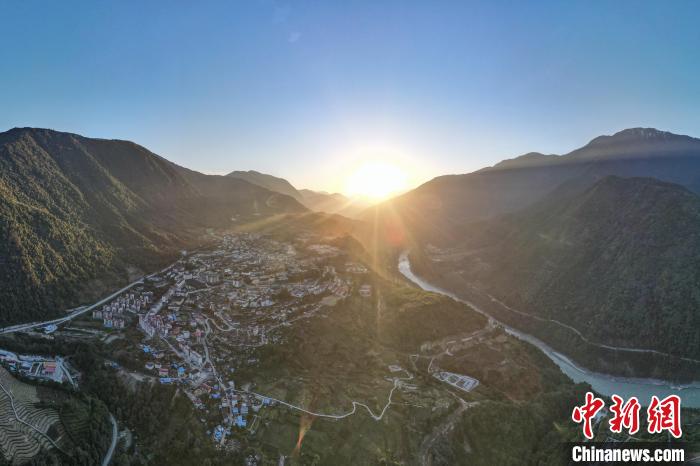 圖為12月19日傍晚,西藏林芝市墨脫縣城日落風(fēng)光,畫面右側(cè)為雅魯藏布江。(無人機(jī)畫面)中新社記者 江飛波 攝