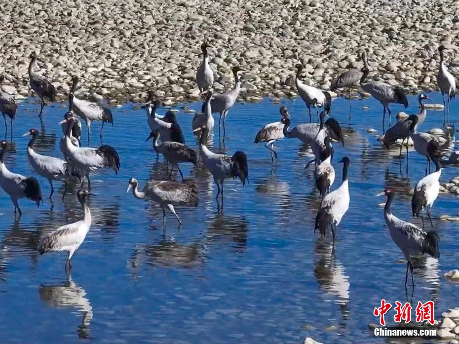 圖為黑頸鶴在雅魯藏布江畔覓食、嬉戲。德吉 攝