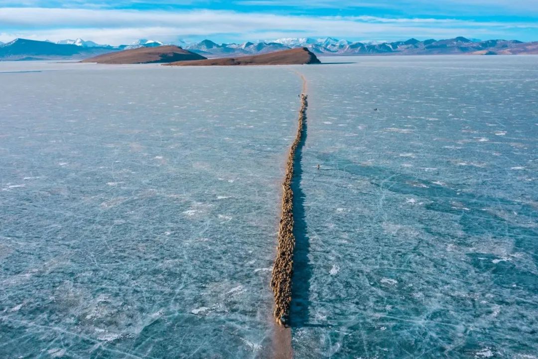 它是世界上海拔最高的村落之一,當(dāng)?shù)卮迕穸家苑拍翞樯?。寒冬?lái)臨,岸上的牧場(chǎng)草料已經(jīng)不夠羊群過(guò)冬,推瓦村的村民們把羊群集結(jié)在一起,在冰湖上撒牛糞爐灰,畫(huà)出一道冰面上的“羊腸小道”把羊群趕上普姆雍錯(cuò)湖心島上吃草過(guò)冬,雖然只有幾公里的距離,但這個(gè)傳承千年的畫(huà)面卻給人以史詩(shī)般的震撼與感動(dòng)。