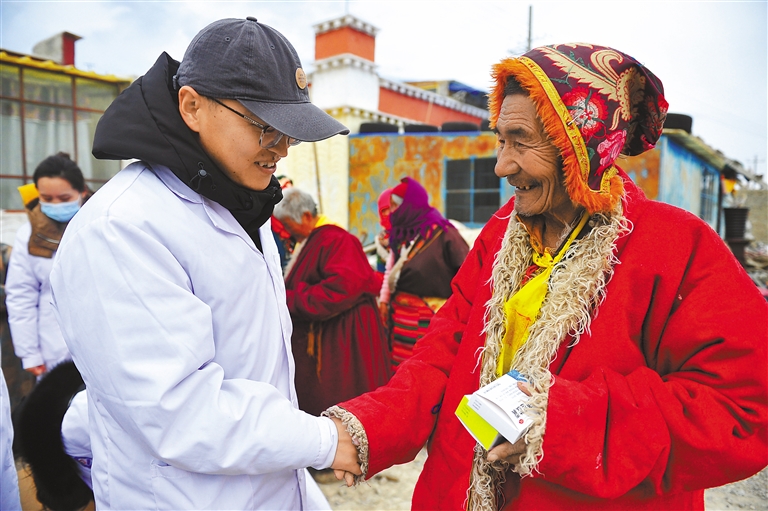 圖為高永濤在下鄉(xiāng)義診中向牧民贈藥并親切交流。記者 溫凱 攝