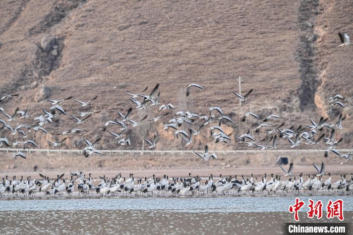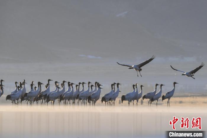 圖為拉薩市林周縣虎頭山水庫越冬的黑頸鶴。貢嘎來松 攝