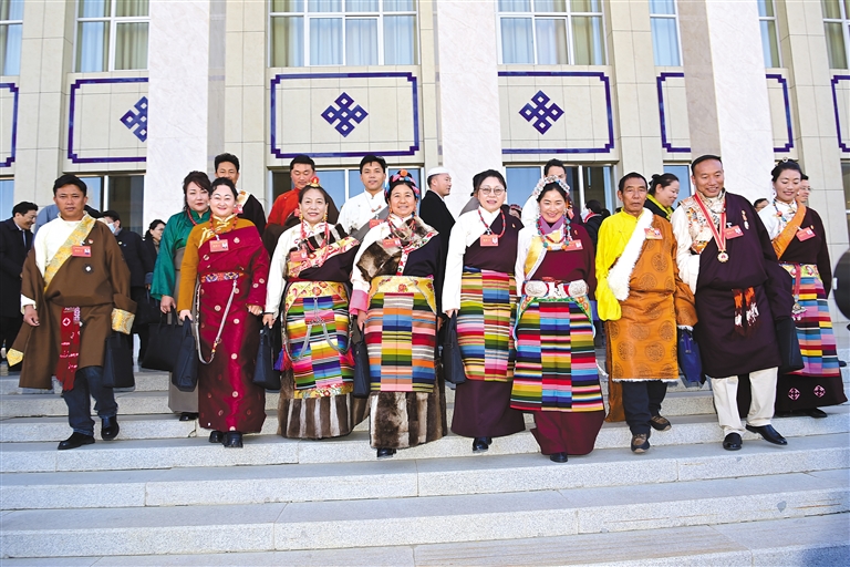 代表們?cè)谖鞑厝嗣駮?huì)堂前合影留念。記者 王敏 攝