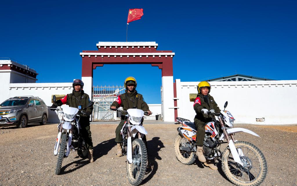 巡護隊員們騎上山地摩托車,準備出發(fā)巡護(2023年12月17日攝)。新華社記者 姜帆 攝