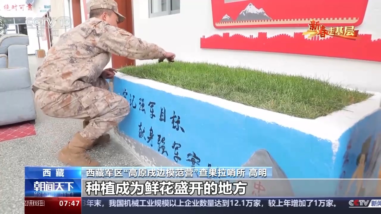 西藏軍區(qū)“高原戍邊模范營”查果拉哨所 高明:我們的戰(zhàn)士現(xiàn)在正在養(yǎng)護(hù)我們的花草。在海拔5318米的這個(gè)地方,我們的花草非常難長(zhǎng),為了能夠營造這種氛圍,我們還是想把這個(gè)地方能夠種植成為鮮花盛開的地方。