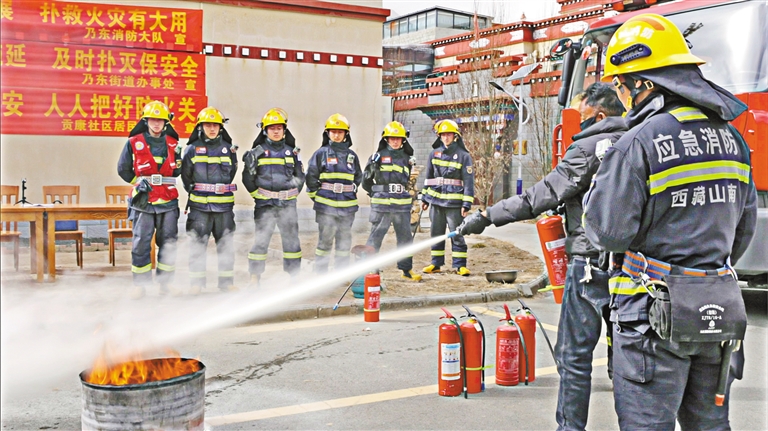 乃東區(qū)消防救援大隊(duì)來(lái)到乃東街道貢康社區(qū),組織駐村工作隊(duì)、網(wǎng)格員、群眾開展消防應(yīng)急演練,進(jìn)一步提升群眾火災(zāi)防范意識(shí)和應(yīng)急處置能力。圖為消防員正在指導(dǎo)群眾進(jìn)行滅火實(shí)操。