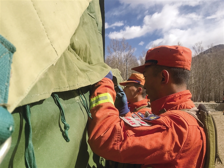 指戰(zhàn)員們在搭建帳篷。記者 桑旦歐珠 攝