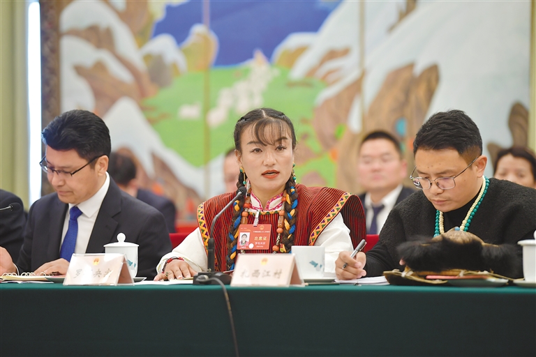 圖為3月6日上午,西藏代表團(tuán)舉行全體會(huì)議,傳達(dá)學(xué)習(xí)習(xí)近平總書記在參加江蘇代表團(tuán)審議時(shí)的重要講話精神,繼續(xù)審議政府工作報(bào)告,審查計(jì)劃報(bào)告和預(yù)算報(bào)告。圖為全國人大代表扎西尼瑪(中)在會(huì)上發(fā)言。