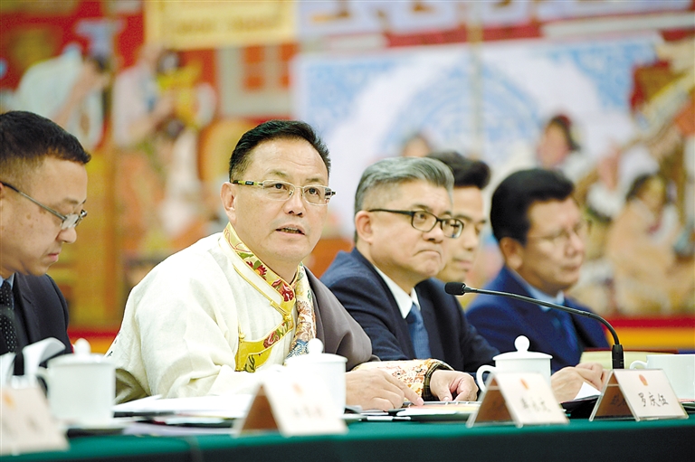 西藏全國人大代表在西藏代表團(tuán)全體會(huì)議上發(fā)言。記者 旦增西旦 攝