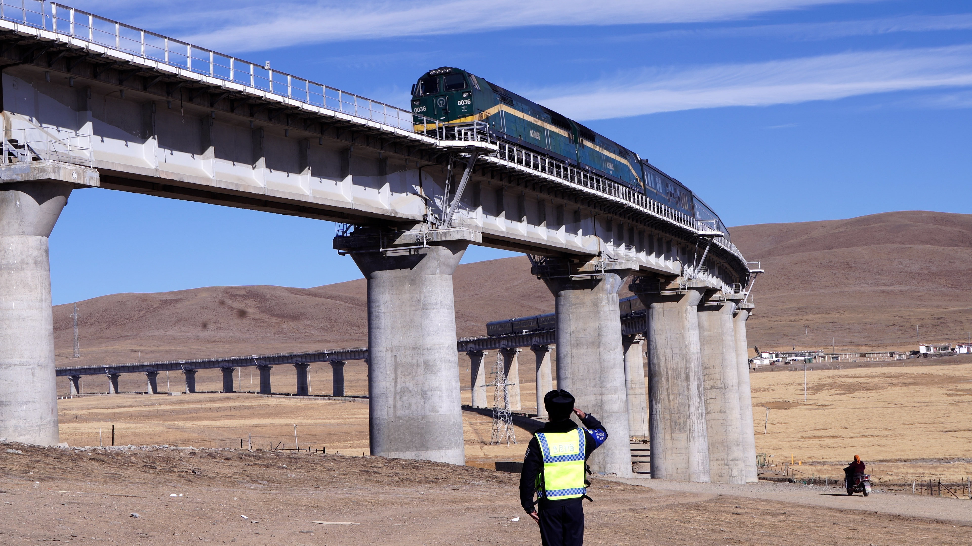 次仁歐珠在向駛過(guò)的列車工作。徐馭堯攝