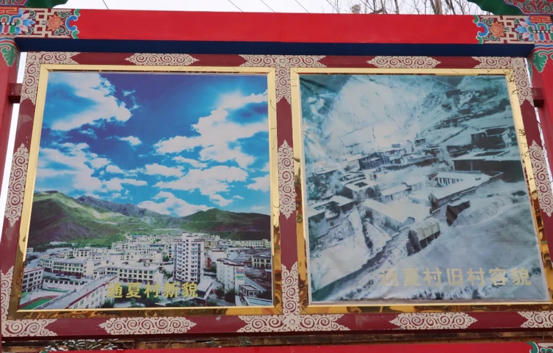 而在通夏村門口,兩幅照片十分顯眼,一幅是通夏村新貌,一幅是舊貌。在舊貌中,低矮的土平房在大雪積壓下,東零西落地散布在起起伏伏的坡面上,冰雪覆蓋的泥濘小道幾乎無(wú)法通行?!斑@樣的土坯房我和先輩們住了幾十年,更早以前,甚至都沒有房子,放牧到哪里,帳篷就支到哪里?!苯衲?3歲的村民達(dá)瓦扎巴指著老照片說(shuō)。而在一旁新貌圖中,蔚藍(lán)的天空下一幢幢藏式小樓整齊林立,寬敞的水泥路通家達(dá)戶,一派欣欣向榮的景象……