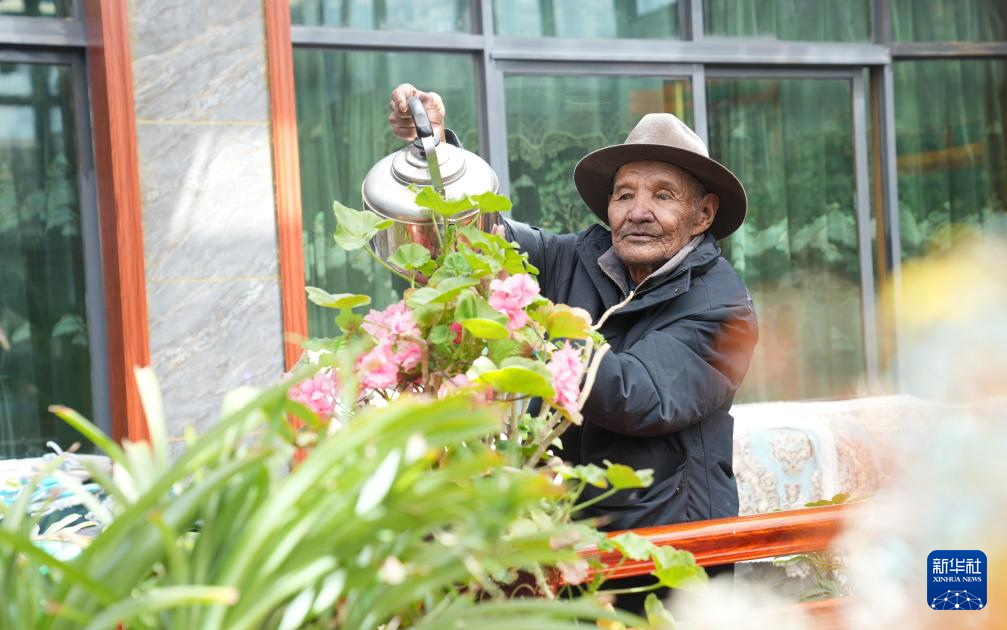 朗杰在自家二樓給花澆水(3月13日攝)。新華社記者 晉美多吉 攝