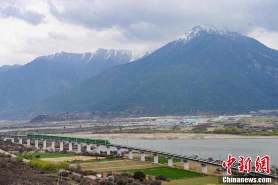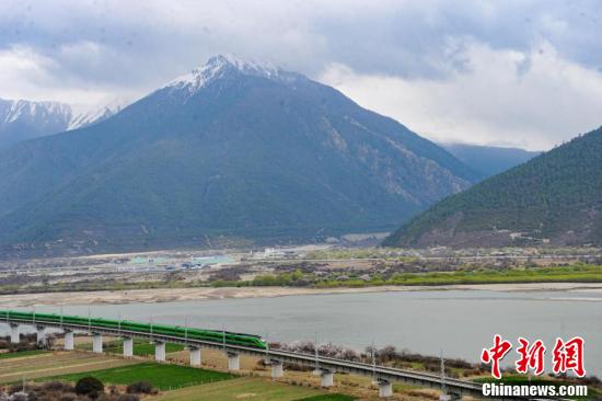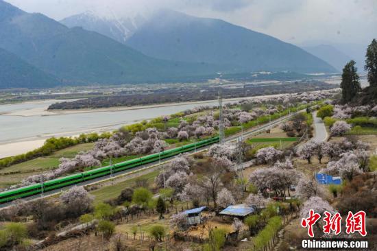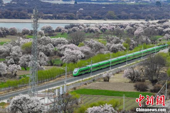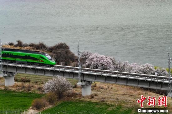 據(jù)悉,拉林鐵路是一條連接西藏拉薩市與林芝市的國鐵Ⅰ級單線電氣化鐵路,全長435公里,設(shè)計(jì)時(shí)速160公里,于2021年6月25日開通運(yùn)營。圖為穿梭在桃花林中的拉林鐵路高原復(fù)興號(hào)。