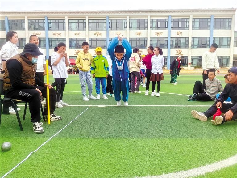 拉薩市第三小學(xué)學(xué)生參加立定跳遠(yuǎn)項目比賽。次仁平措