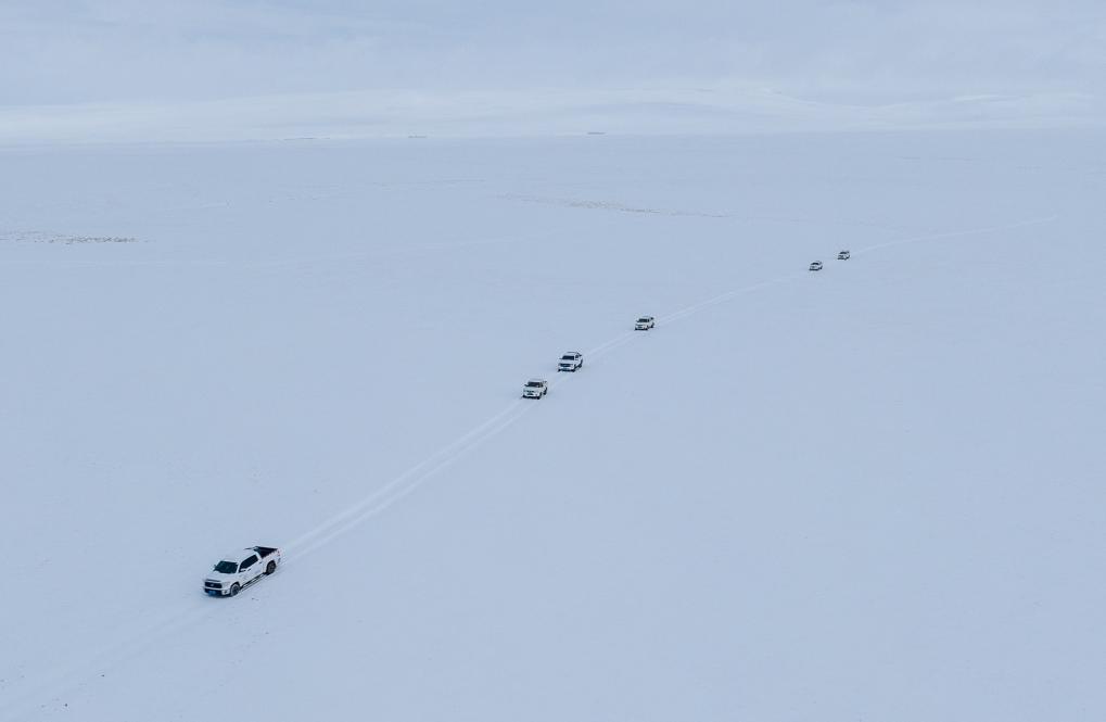 野生動(dòng)物專業(yè)管護(hù)隊(duì)員的車隊(duì)在大雪中巡護(hù)(無人機(jī)照片,5月8日攝)。新華社記者 丁增尼達(dá) 攝