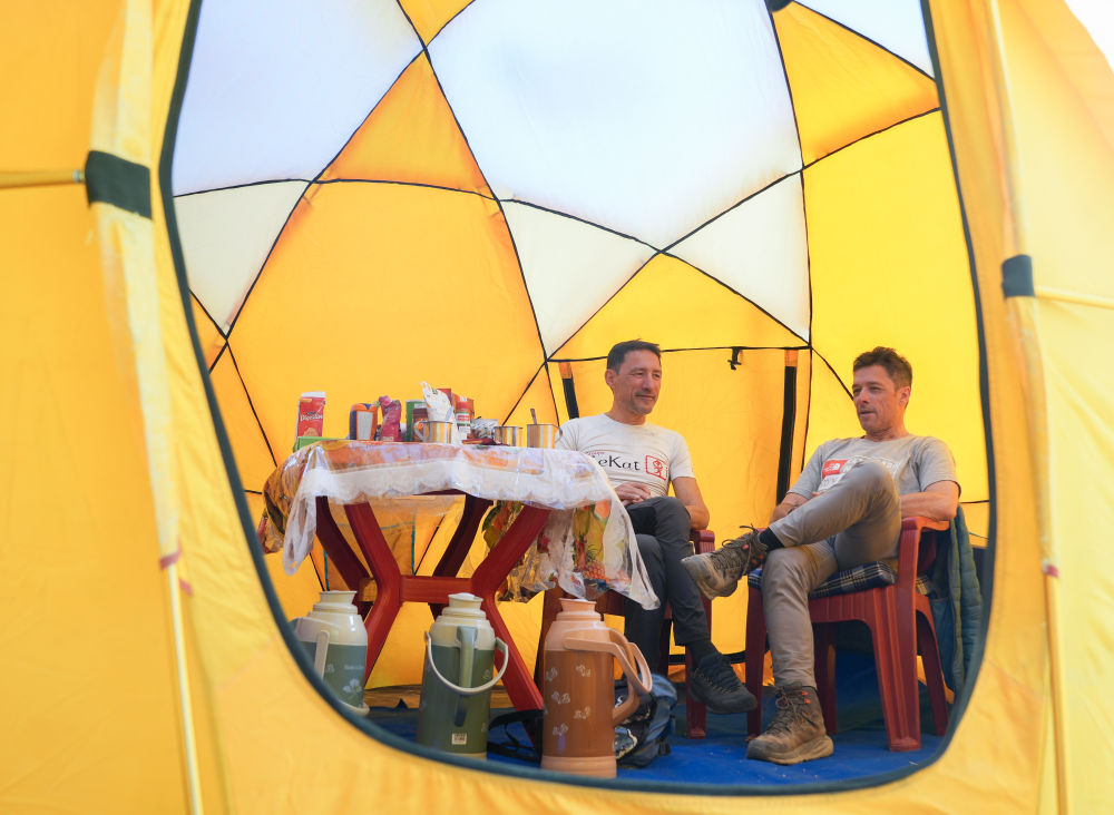 在珠峰登山大本營(yíng),德諾埃爾兄弟在帳篷里聊天休息(5月17日攝)。新華社記者 丁汀 攝