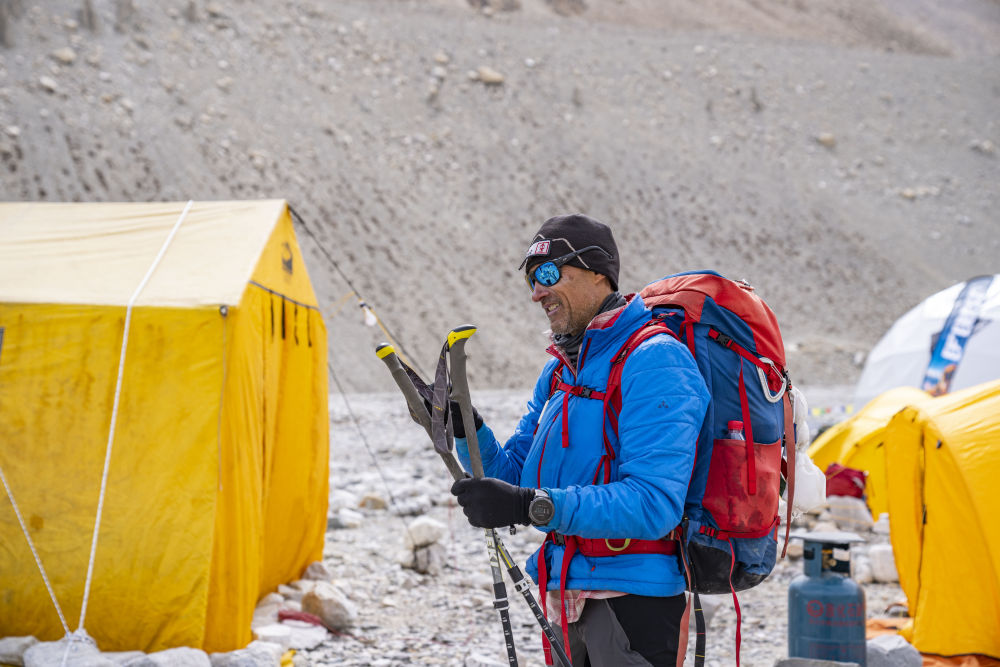 在珠峰登山大本營(yíng),弟弟帕斯卡爾·德諾埃爾正在整理自己的登山杖(5月18日攝)。新華社記者 孫非 攝