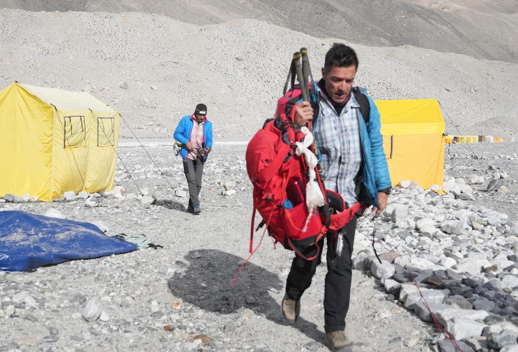 哈康·埃蘭森(右)正在搬運自己的登山物資(5月24日攝)。新華社記者 孫非 攝