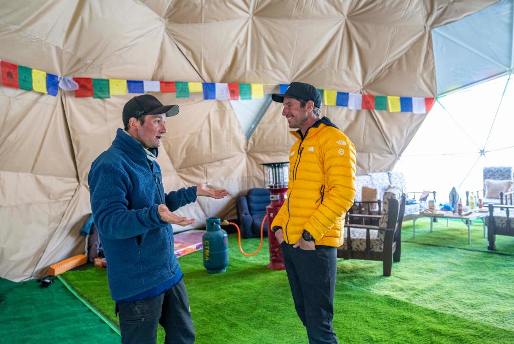在珠峰登山大本營,盧卡斯·富滕巴赫(右)正在和隊友哈康·埃蘭森聊天交流(5月24日攝)。新華社記者 孫非 攝