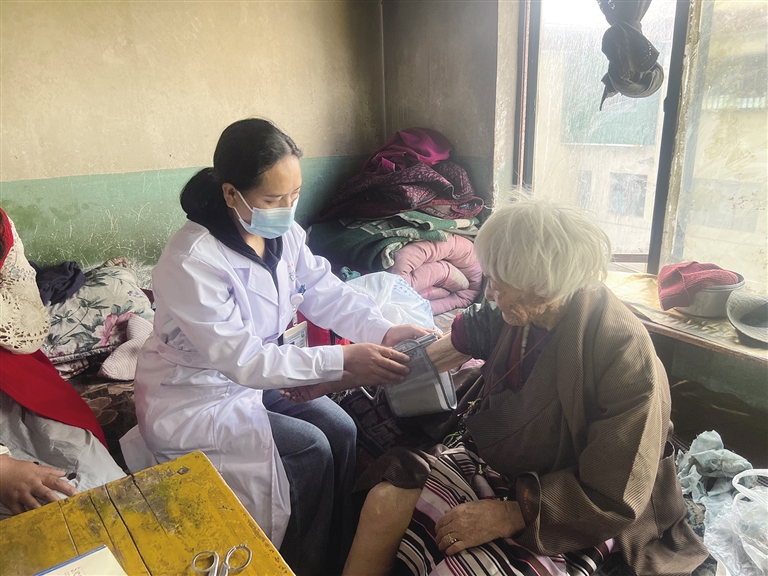 跟隨林聚社區(qū)黨支部書記扎西尼瑪?shù)哪_步,記者走進(jìn)一戶人家。客廳中,一位頭發(fā)花白、身形佝僂的老人正側(cè)躺在沙發(fā)上閉目養(yǎng)神。老人名叫仁措,今年已經(jīng)94歲。看見(jiàn)扎西尼瑪?shù)絹?lái),兩人親切地拉起了家常。細(xì)心詢問(wèn)老人的身體狀況后,扎西尼瑪和社區(qū)工作人員便開始為老人打掃房間。因老人行動(dòng)不便,廁所有些污垢,工作人員仔細(xì)進(jìn)行了清理。隨后,工作人員將老人的臟衣服全部收集拿回社區(qū)清洗。見(jiàn)到老人精神有些不佳,扎西尼瑪叫來(lái)社區(qū)的衛(wèi)生服務(wù)隊(duì)為老人檢查身體。