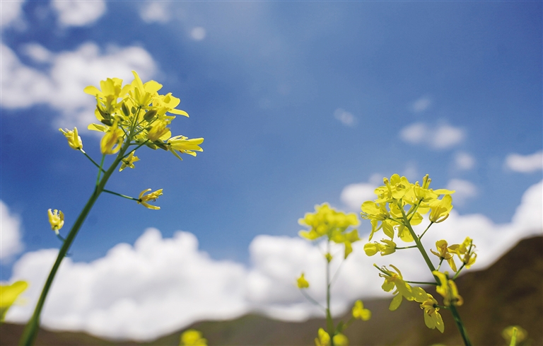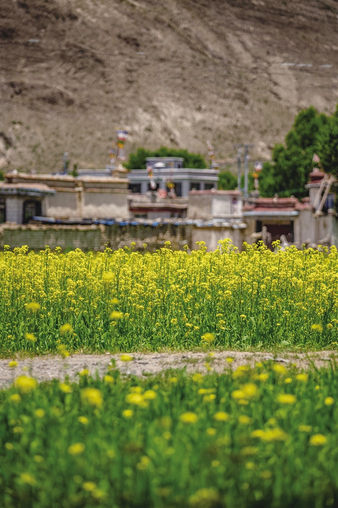 西藏的春天可以欣賞桃花,夏天可以欣賞什么花?那當(dāng)然是油菜花。近期,西藏各地迎來了油菜花盛開的季節(jié)。行走在夏日的農(nóng)田里,金黃色的油菜花給綠意盎然的農(nóng)田增添了幾分色彩。放眼望去,在藍(lán)天白云的映襯下,油菜花海如同金黃色的毯子般鋪展開來,花海在微風(fēng)中輕聲搖曳,與一旁的道路、錯落有致的村居共同構(gòu)成了一幅和諧美麗的田園風(fēng)景圖。